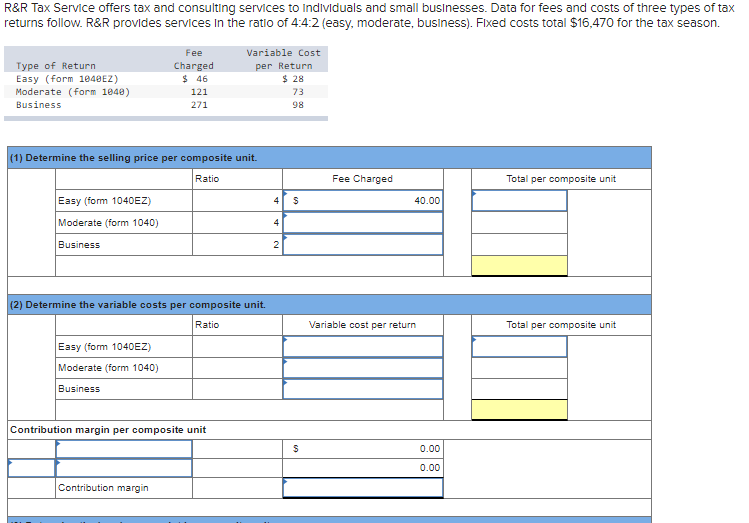 Data for fees and costs of three types of tax returns follow. RR Tax Service offers tax and consulting services to individuals and small businesses. RR Tax Service offers tax and consulting services to individuals and small businesses.