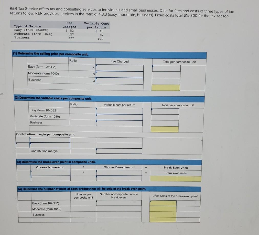 R R Tax Service offers tax and consulting services to individuals and small businesses. Fixed costs total 18000.